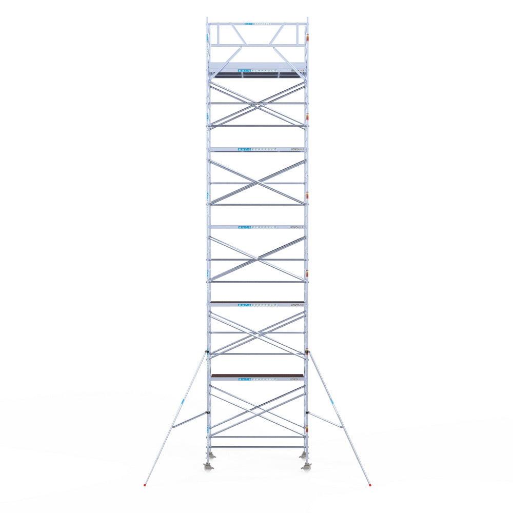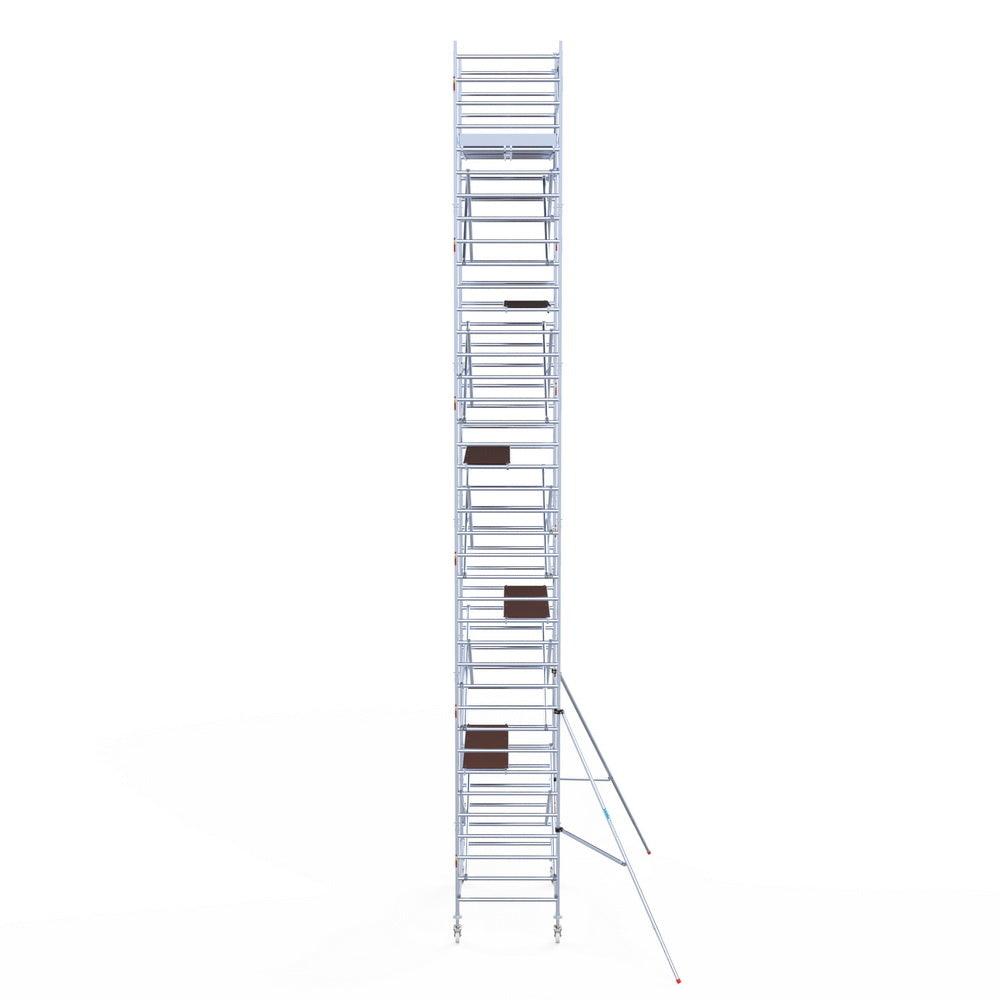 Unsere Rollgerüste sind in verschiedenen Breiten erhältlich, typischerweise 75 cm, 90 cm und 135 cm, abhängig vom jeweiligen Modell und der Produktlinie (semi-professionell oder professionell). Die 75 cm Breite ist ideal für beengte Räume, während 135 cm maximale Arbeitsfläche bietet.