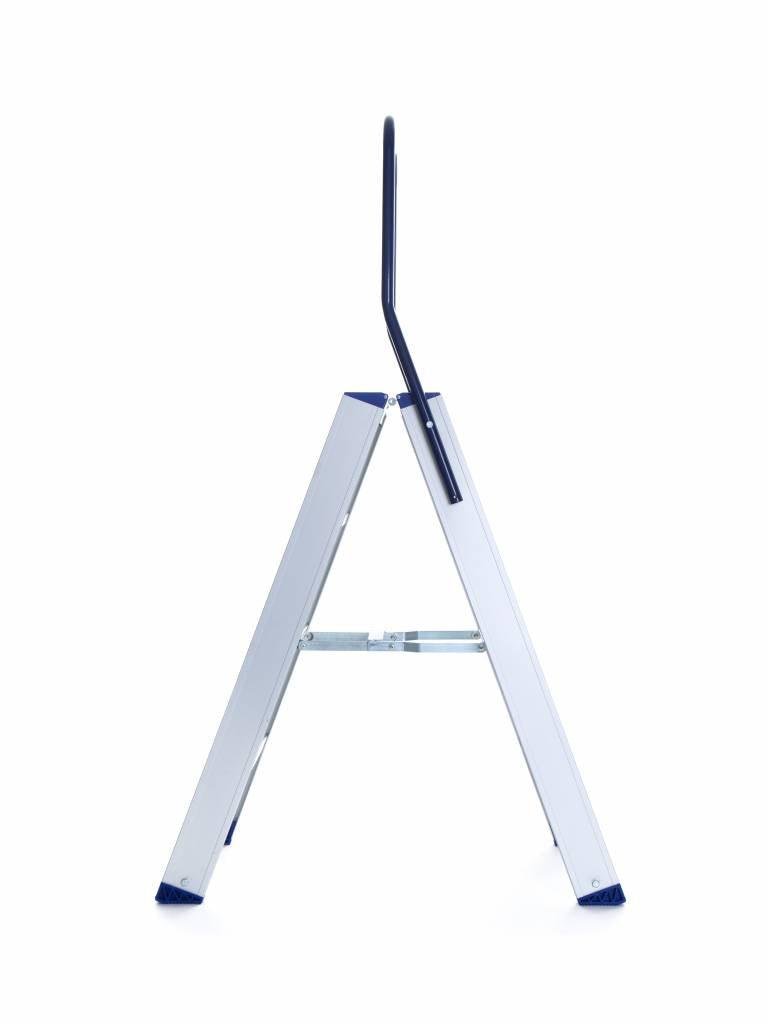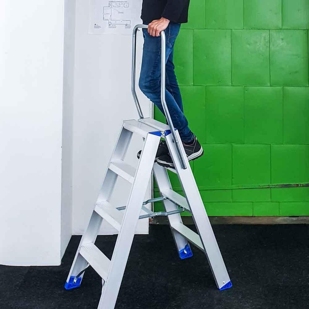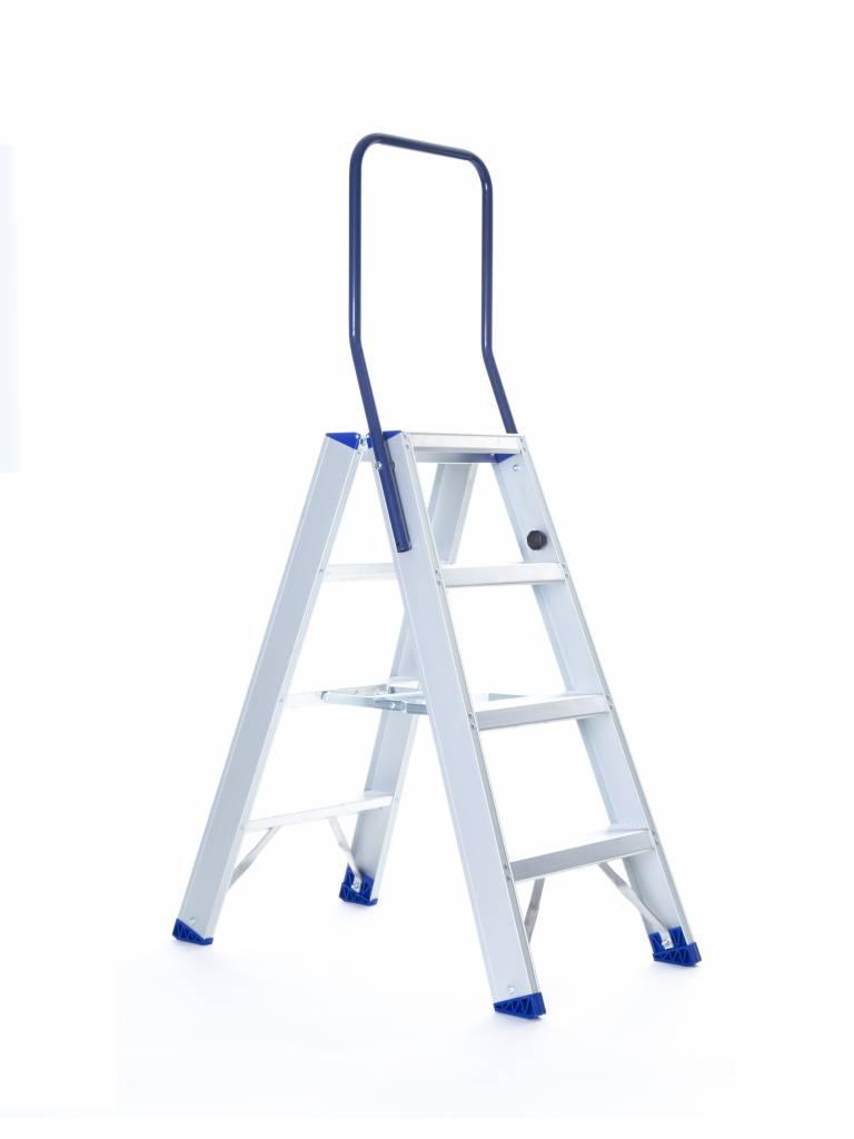 Cet escalier double robuste à quatre marches convient aux professionnels et aux bricoleurs. Les escaliers peuvent être montés des deux côtés. Les escaliers légers d'Eurostairs sont fabriqués en aluminium de haute qualité et disposent d'un revêtement anti-salissures et d'un mécanisme de pliage pratique. Les escaliers ont un barreau replié sous chaque marche pour une bonne stabilité. Les marches ont une bande de roulement antidérapante et les pieds sont équipés de capuchons antidérapants pour plus de stabilité et de sécurité. L'escalier double est livré en standard avec une genouillère. Les escaliers sont homologués et conformes aux normes de sécurité néerlandaises et européennes.