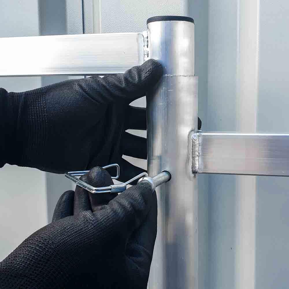 Les clips de sécurité sont utilisés pour relier les cadres des échafaudages mobiles et intérieurs. L’utilisation de clips de fixation ajoute une solidité supplémentaire à votre échafaudage et garantit que tout est solidement fixé pour empêcher le soulèvement par le vent. La connexion des cadres n'est nécessaire que pour les échafaudages mobiles avec un boulon droit. Sur les échafaudages intérieurs, les roues peuvent être sécurisées avec des clips de verrouillage. Le diamètre d'un clip de verrouillage est de 9,5 mm et la longueur est de 65 mm.