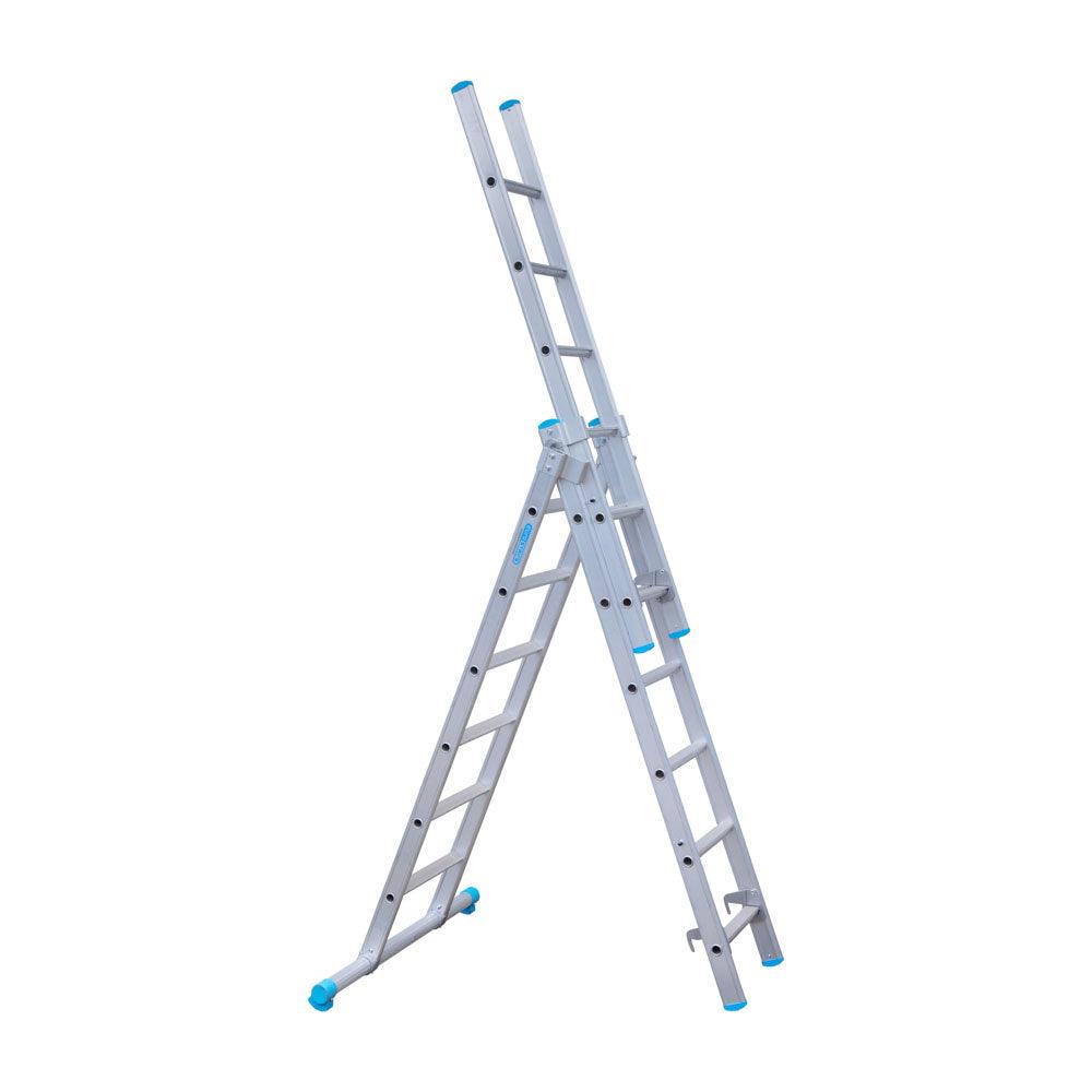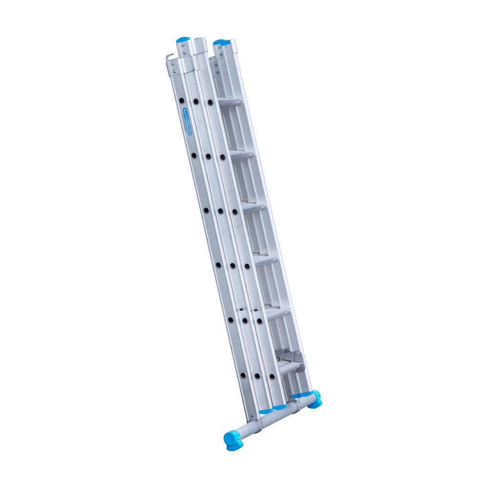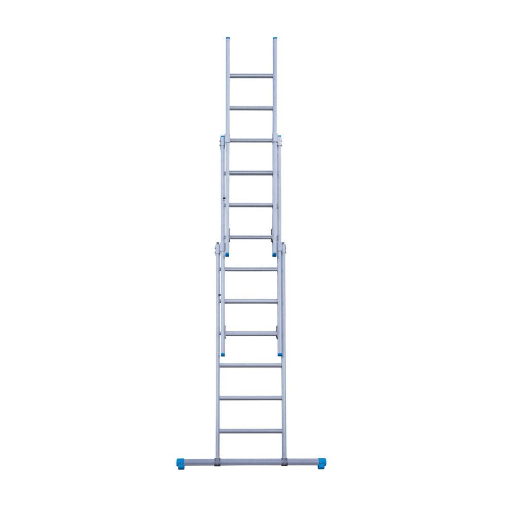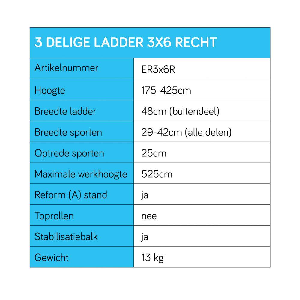 Gerade dreiteilige Mehrzweckleiter mit 3x6 Sprossen, für Arbeiten im Innen- und Außenbereich in verschiedenen Höhen. Die Leiter kann in der A-Position ausgezogen werden und muss nicht an eine Fassade gelehnt werden. Die 3-teilige Leiter aus strapazierfähigem Aluminium ist durch ihr geringes Gewicht leicht zu bewegen. Eingefahren ist die Leiter 1,75 m lang und ausgefahren bis zu 4,25 m. Die maximale Arbeitshöhe beträgt 5,25 Meter. Die Mehrzweckleiter von Eurostairs ist mit zusätzlichen Verstärkungspunkten und Anti-Rutsch-Kappen ausgestattet. Dank der Stabilitätsstange steht die Leiter besonders sicher. Die Leiter ist gemäß der europäischen Gesetzgebung EN131 zugelassen und für den professionellen Einsatz geeignet.
