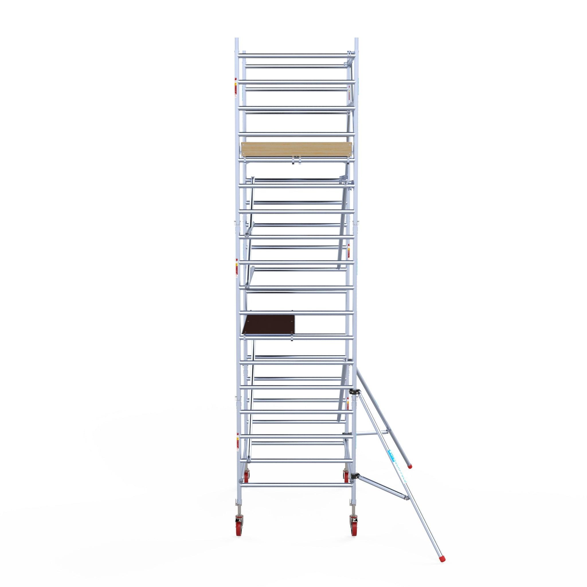 Unsere Rollgerüste sind in verschiedenen Breiten erhältlich, typischerweise 75 cm, 90 cm und 135 cm, abhängig vom jeweiligen Modell und der Produktlinie (semi-professionell oder professionell). Die 75 cm Breite ist ideal für beengte Räume, während 135 cm maximale Arbeitsfläche bietet.
