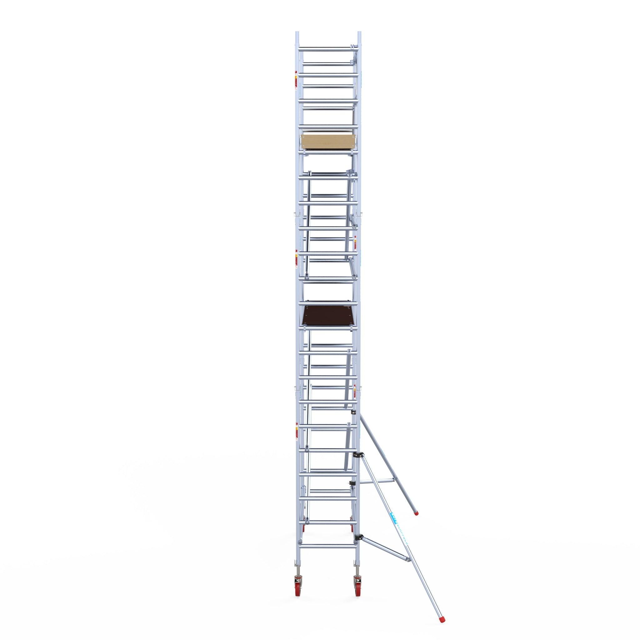 Unsere Rollgerüste sind in verschiedenen Breiten erhältlich, typischerweise 75 cm, 90 cm und 135 cm, abhängig vom jeweiligen Modell und der Produktlinie (semi-professionell oder professionell). Die 75 cm Breite ist ideal für beengte Räume, während 135 cm maximale Arbeitsfläche bietet.