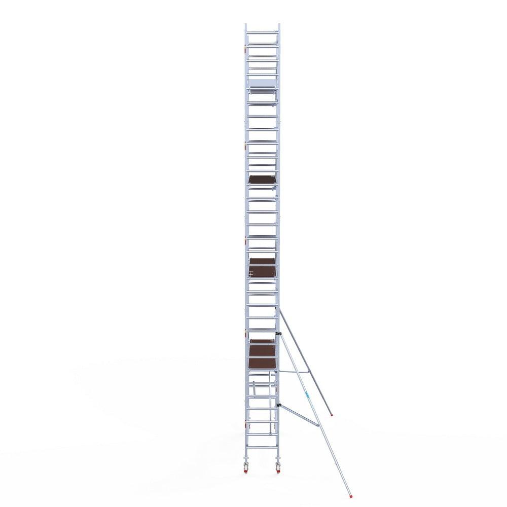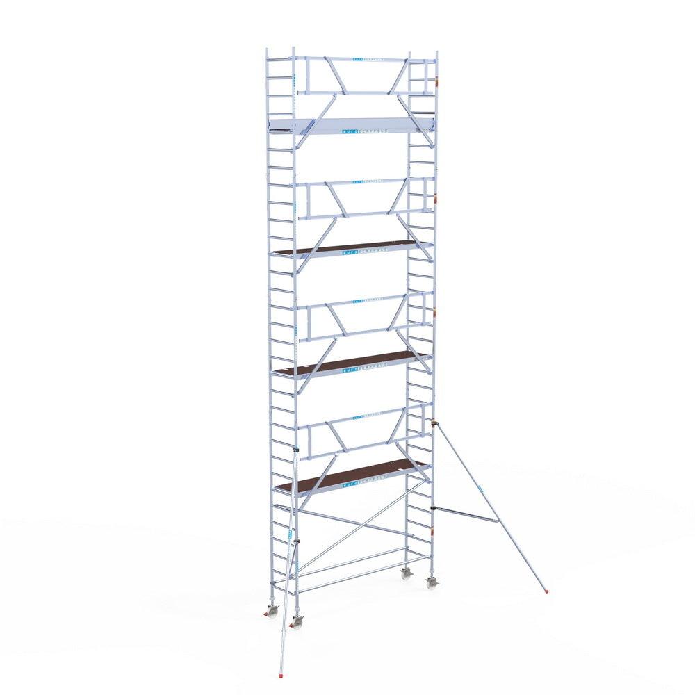 Unsere Rollgerüste sind in verschiedenen Breiten erhältlich, typischerweise 75 cm, 90 cm und 135 cm, abhängig vom jeweiligen Modell und der Produktlinie (semi-professionell oder professionell). Die 75 cm Breite ist ideal für beengte Räume, während 135 cm maximale Arbeitsfläche bietet.