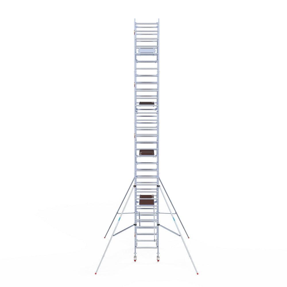 Unsere Rollgerüste sind in verschiedenen Breiten erhältlich, typischerweise 75 cm, 90 cm und 135 cm, abhängig vom jeweiligen Modell und der Produktlinie (semi-professionell oder professionell). Die 75 cm Breite ist ideal für beengte Räume, während 135 cm maximale Arbeitsfläche bietet.