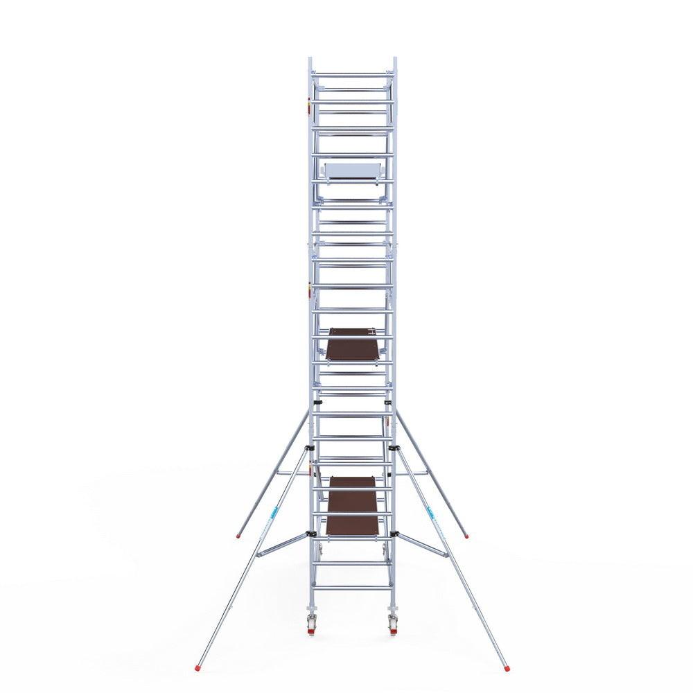 Unsere Rollgerüste sind in verschiedenen Breiten erhältlich, typischerweise 75 cm, 90 cm und 135 cm, abhängig vom jeweiligen Modell und der Produktlinie (semi-professionell oder professionell). Die 75 cm Breite ist ideal für beengte Räume, während 135 cm maximale Arbeitsfläche bietet.