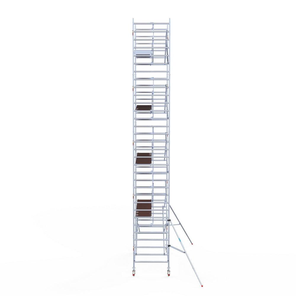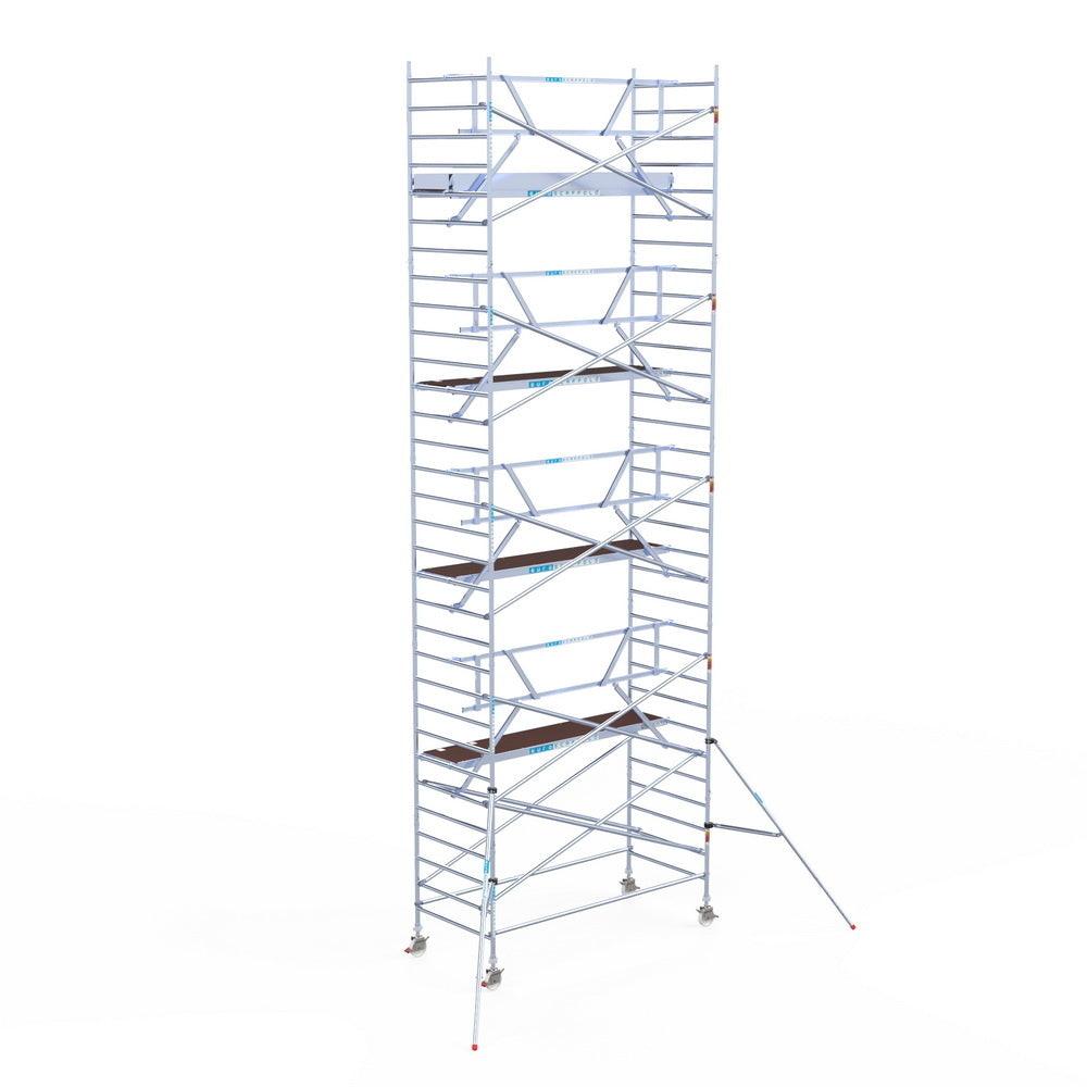 Unsere Rollgerüste sind in verschiedenen Breiten erhältlich, typischerweise 75 cm, 90 cm und 135 cm, abhängig vom jeweiligen Modell und der Produktlinie (semi-professionell oder professionell). Die 75 cm Breite ist ideal für beengte Räume, während 135 cm maximale Arbeitsfläche bietet.