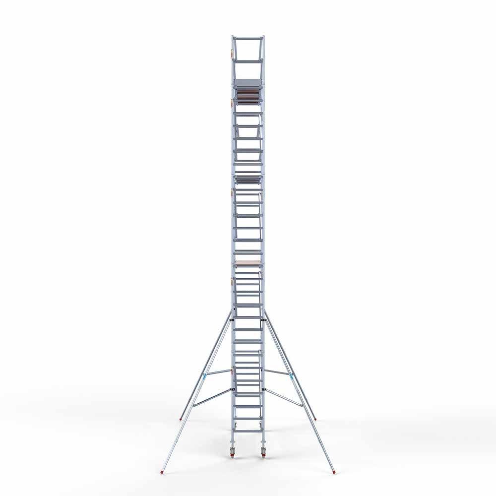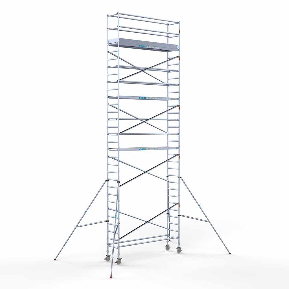 Unsere Rollgerüste sind in verschiedenen Breiten erhältlich, typischerweise 75 cm, 90 cm und 135 cm, abhängig vom jeweiligen Modell und der Produktlinie (semi-professionell oder professionell). Die 75 cm Breite ist ideal für beengte Räume, während 135 cm maximale Arbeitsfläche bietet.