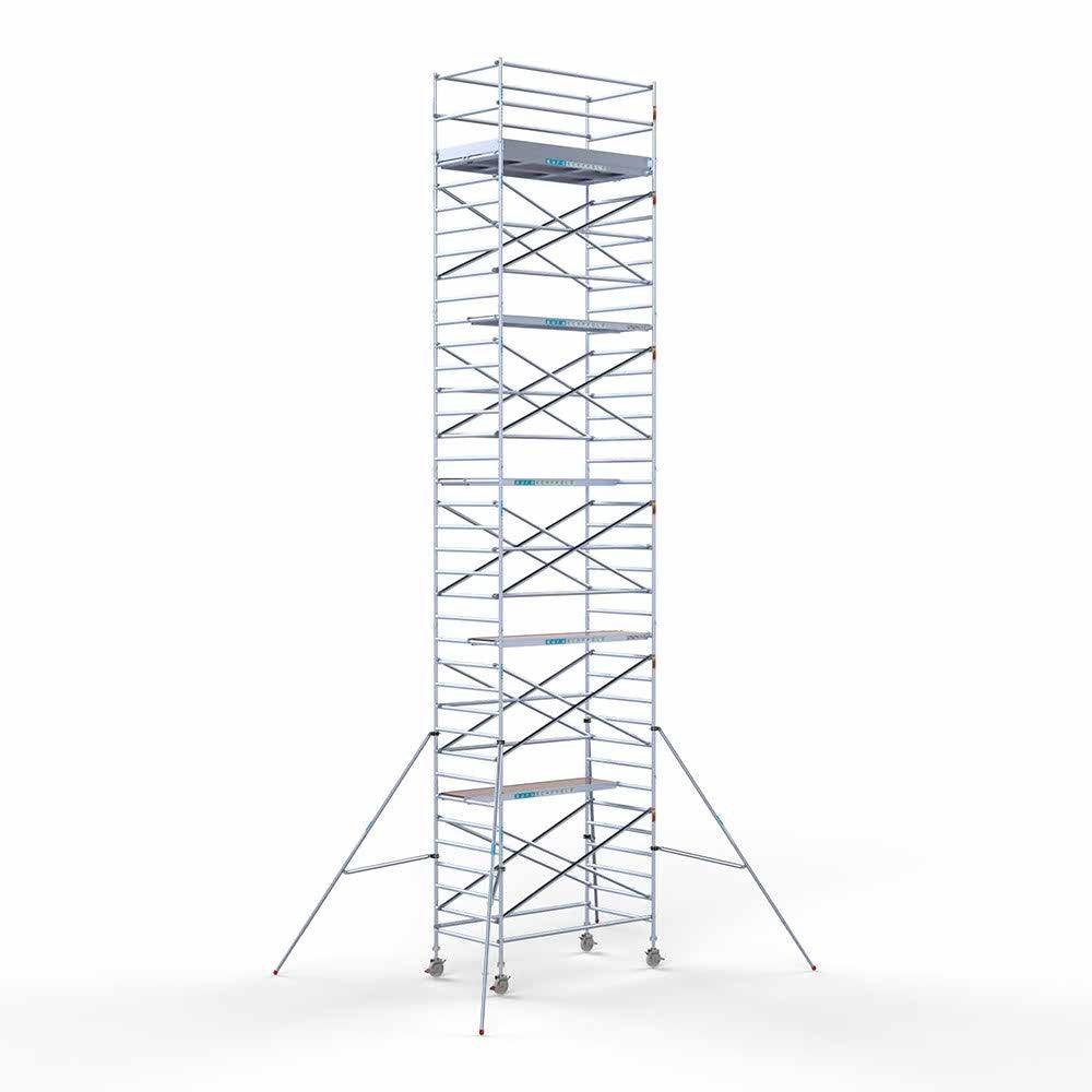 Unsere Rollgerüste sind in verschiedenen Breiten erhältlich, typischerweise 75 cm, 90 cm und 135 cm, abhängig vom jeweiligen Modell und der Produktlinie (semi-professionell oder professionell). Die 75 cm Breite ist ideal für beengte Räume, während 135 cm maximale Arbeitsfläche bietet.