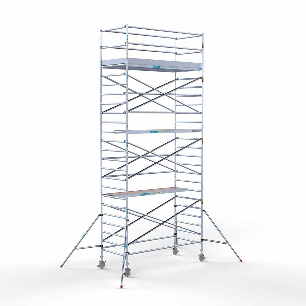 Unsere Rollgerüste sind in verschiedenen Breiten erhältlich, typischerweise 75 cm, 90 cm und 135 cm, abhängig vom jeweiligen Modell und der Produktlinie (semi-professionell oder professionell). Die 75 cm Breite ist ideal für beengte Räume, während 135 cm maximale Arbeitsfläche bietet.