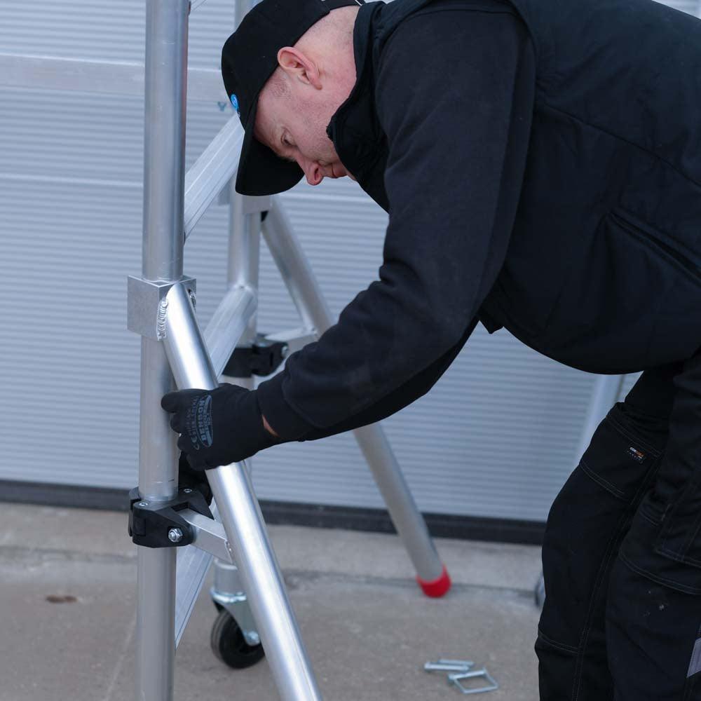 Der Euroscaffold Ministab wurde speziell für die Befestigung an Zimmergerüsten mit einer Breite von 75 cm entwickelt. Mit der Einführung der neuen europäischen Vorschrift EN 1004 ist die Verwendung eines Stabilisators an einem Zimmergerüst obligatorisch geworden. Mit dem Ministab erfüllt Ihr Zimmergerüst diese Vorschriften und Sie können sicher und gesetzeskonform arbeiten.
