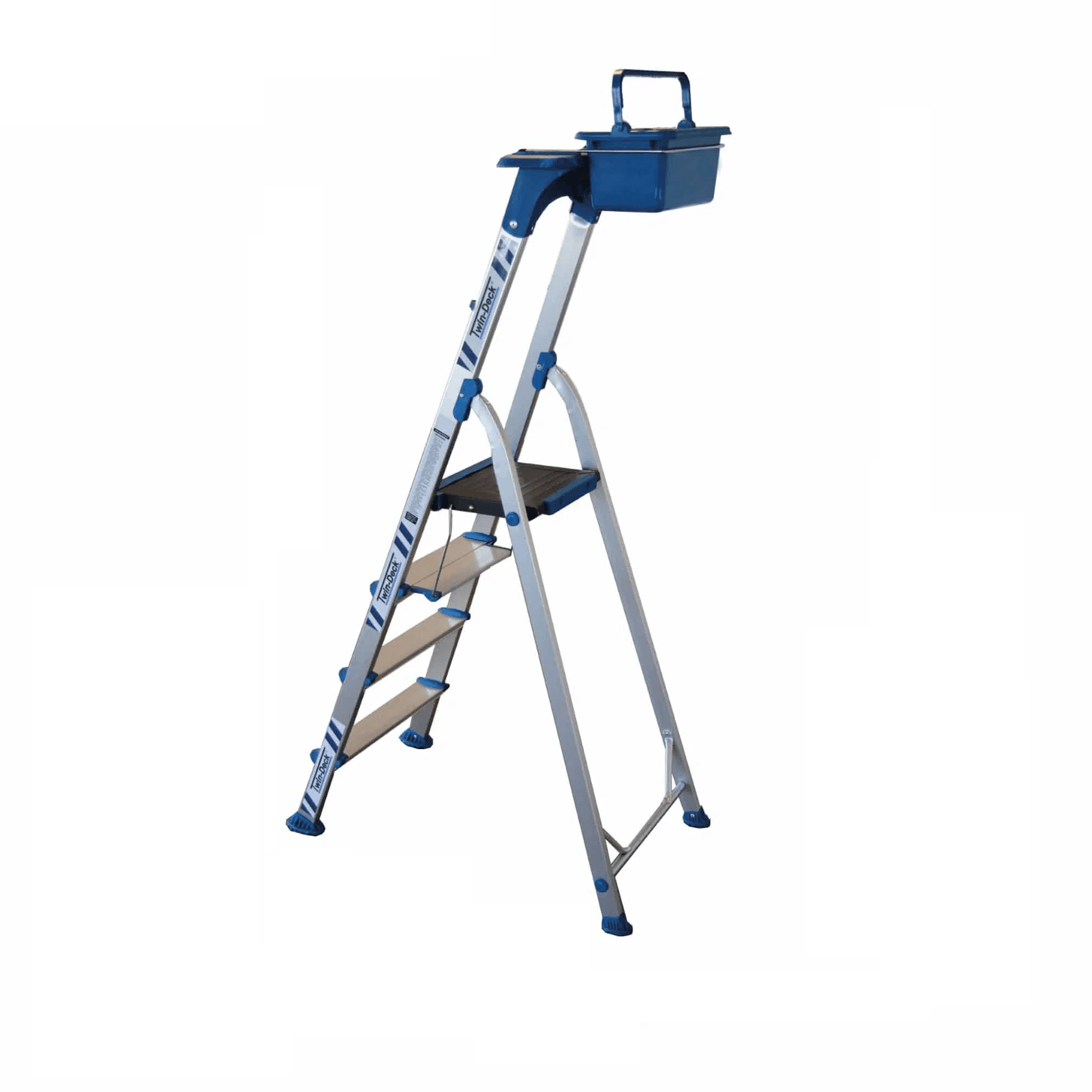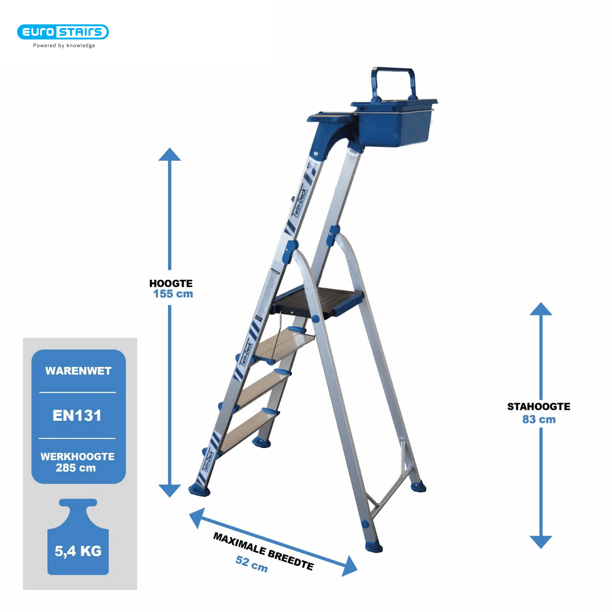 Die Twin Deck Treppen sind mit einer Reihe von Zusatzausstattungen versehen. Dazu gehören rutschfeste Fußkappen, eine Plattform mit spezieller Anti-Rutsch-Beschichtung, ein Haken zum Aufhängen eines Eimers und eine Aussparung im Sicherheitsgeländer für kleine Werkzeuge. Dank der doppelten Stufen stehen Sie auch stabiler und fester auf der Haushaltstreppe.