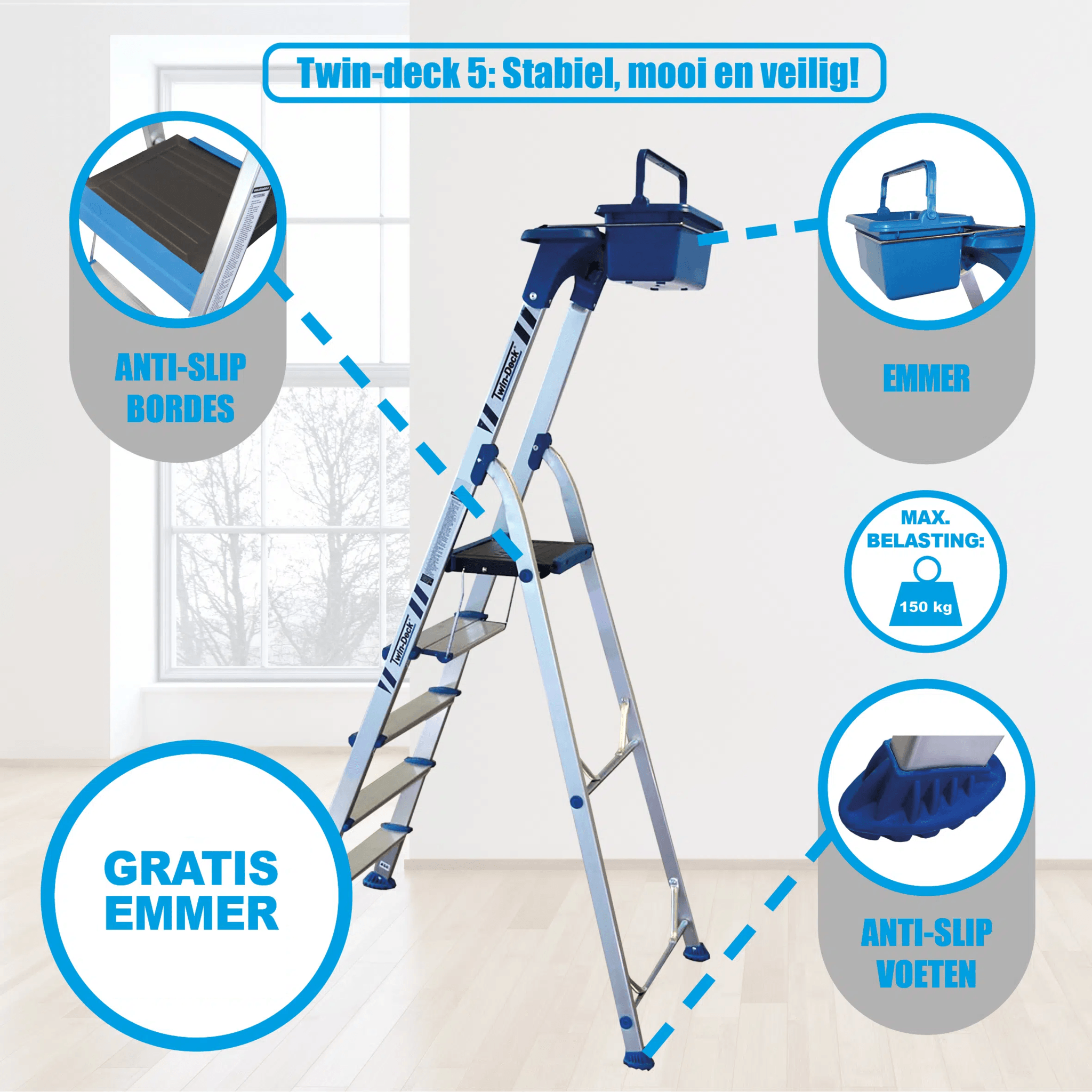 Die robuste Treppe ist aus Aluminium gefertigt und kann daher sowohl im Innen- als auch im Außenbereich verwendet werden. Mit dem Handgriff können Sie die Treppe einfach zusammenklappen. Alle Stufen, einschließlich des Podestes, sind mit einer Anti-Rutsch-Beschichtung versehen. Die Haushaltstreppe lässt sich leicht von einer Person anheben und bewegen. Wird immer mit einer 2-Jahres-Garantie geliefert.