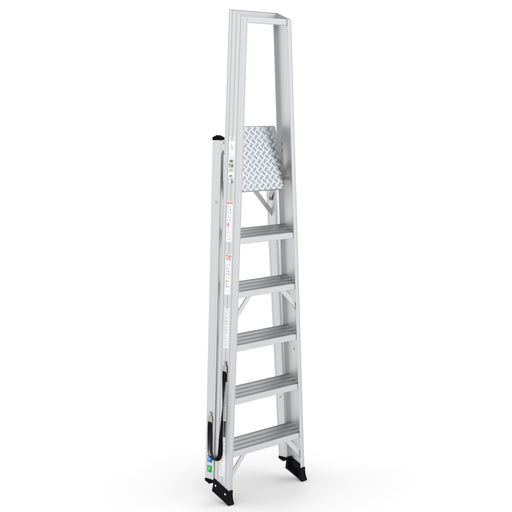 Stehleiter 1x6 Stufen Spezifikationen: Anzahl der Stufen: 1x6 Länge geschlossen: 230 cm Höhe stehend: 213 cm Höhe der Plattform: 151 cm Breite Bod...