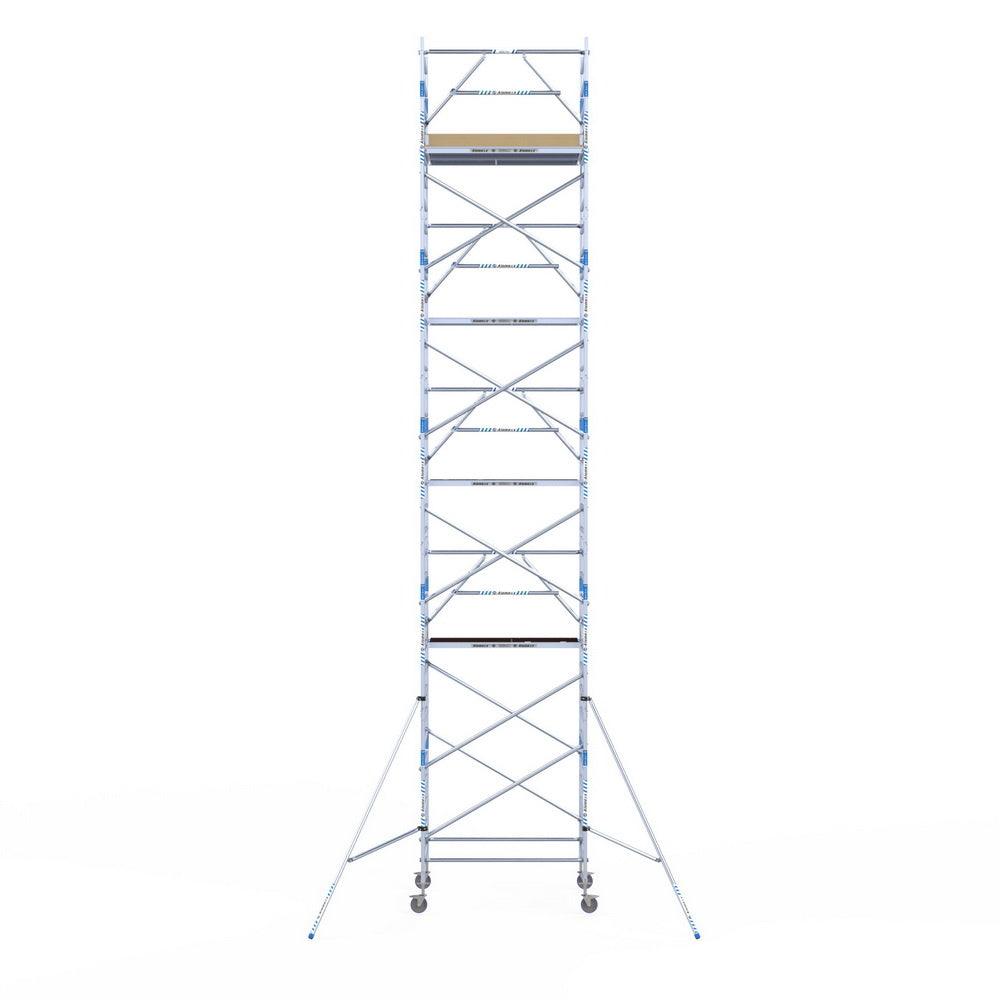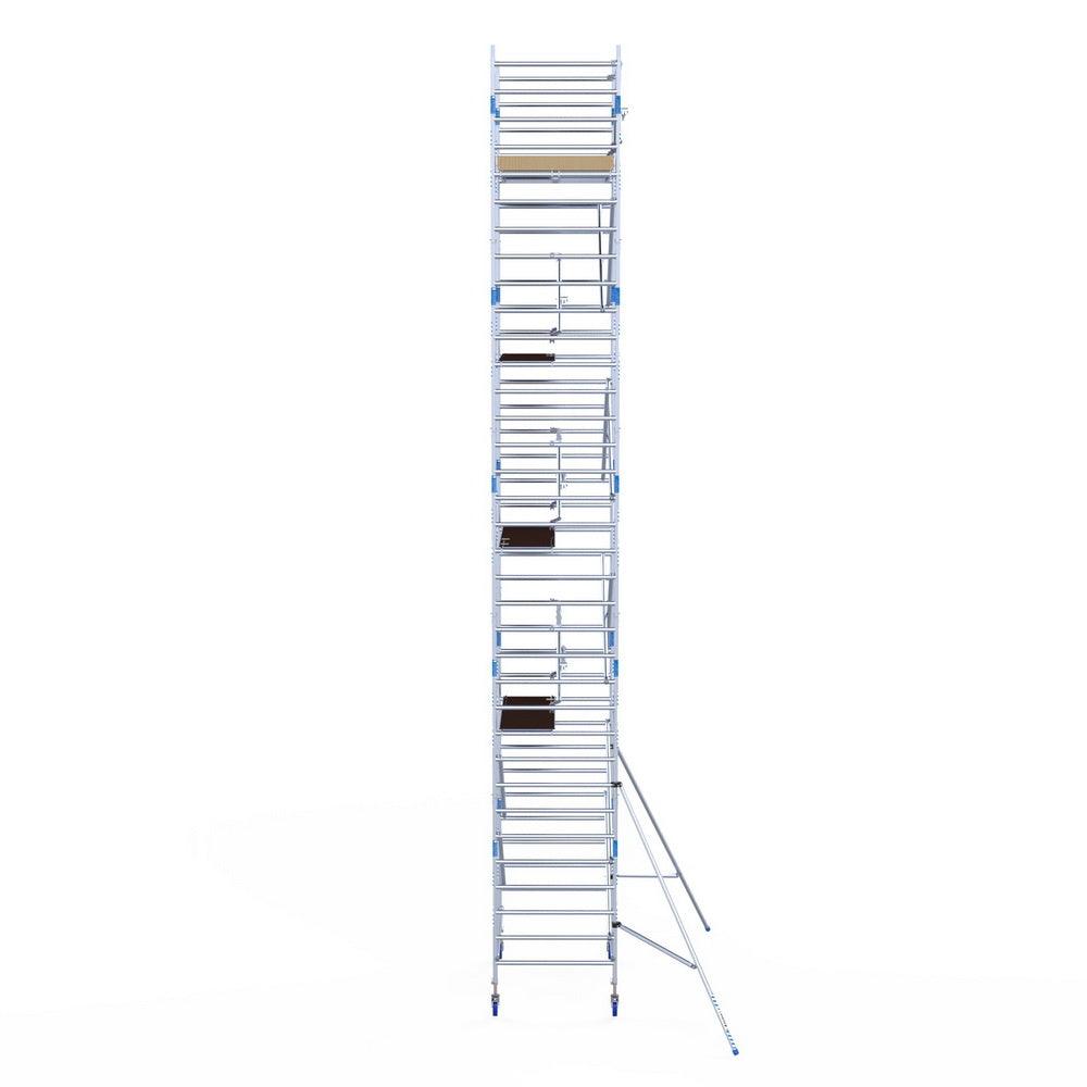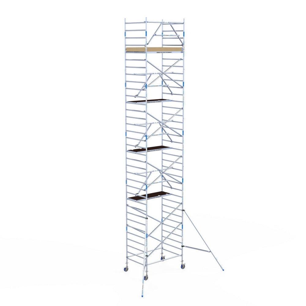 Unsere Rollgerüste sind in verschiedenen Breiten erhältlich, typischerweise 75 cm, 90 cm und 135 cm, abhängig vom jeweiligen Modell und der Produktlinie (semi-professionell oder professionell). Die 75 cm Breite ist ideal für beengte Räume, während 135 cm maximale Arbeitsfläche bietet.