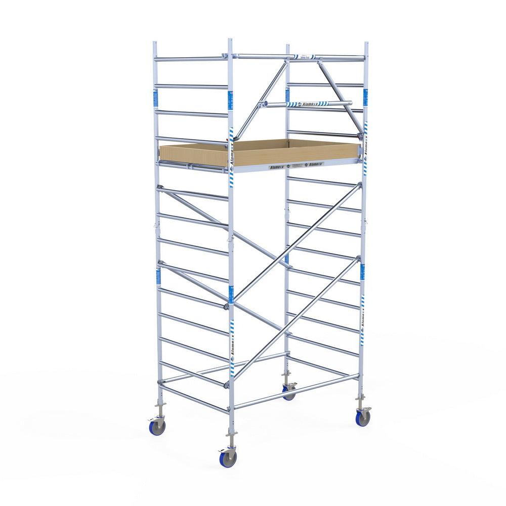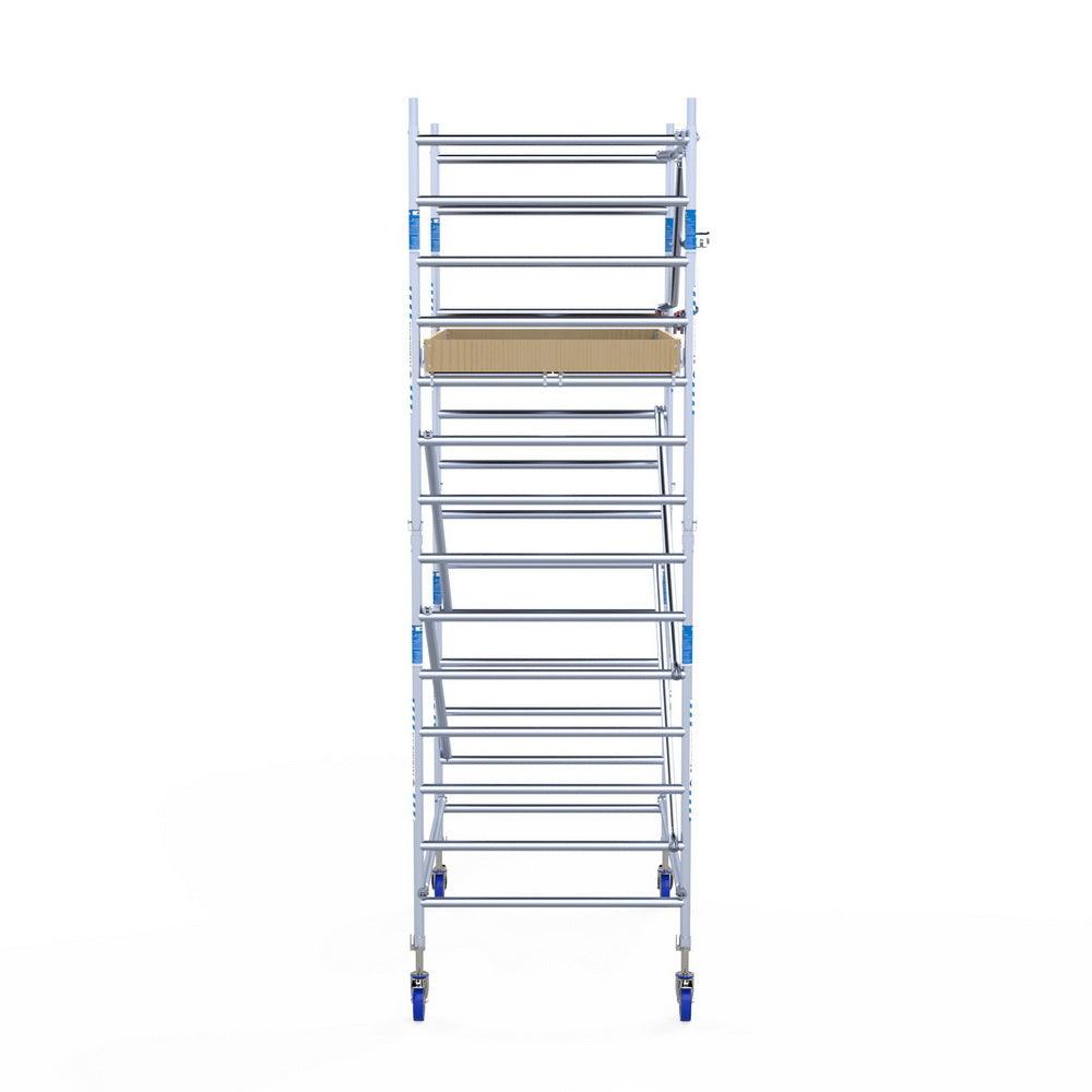 Unsere Rollgerüste sind in verschiedenen Breiten erhältlich, typischerweise 75 cm, 90 cm und 135 cm, abhängig vom jeweiligen Modell und der Produktlinie (semi-professionell oder professionell). Die 75 cm Breite ist ideal für beengte Räume, während 135 cm maximale Arbeitsfläche bietet.