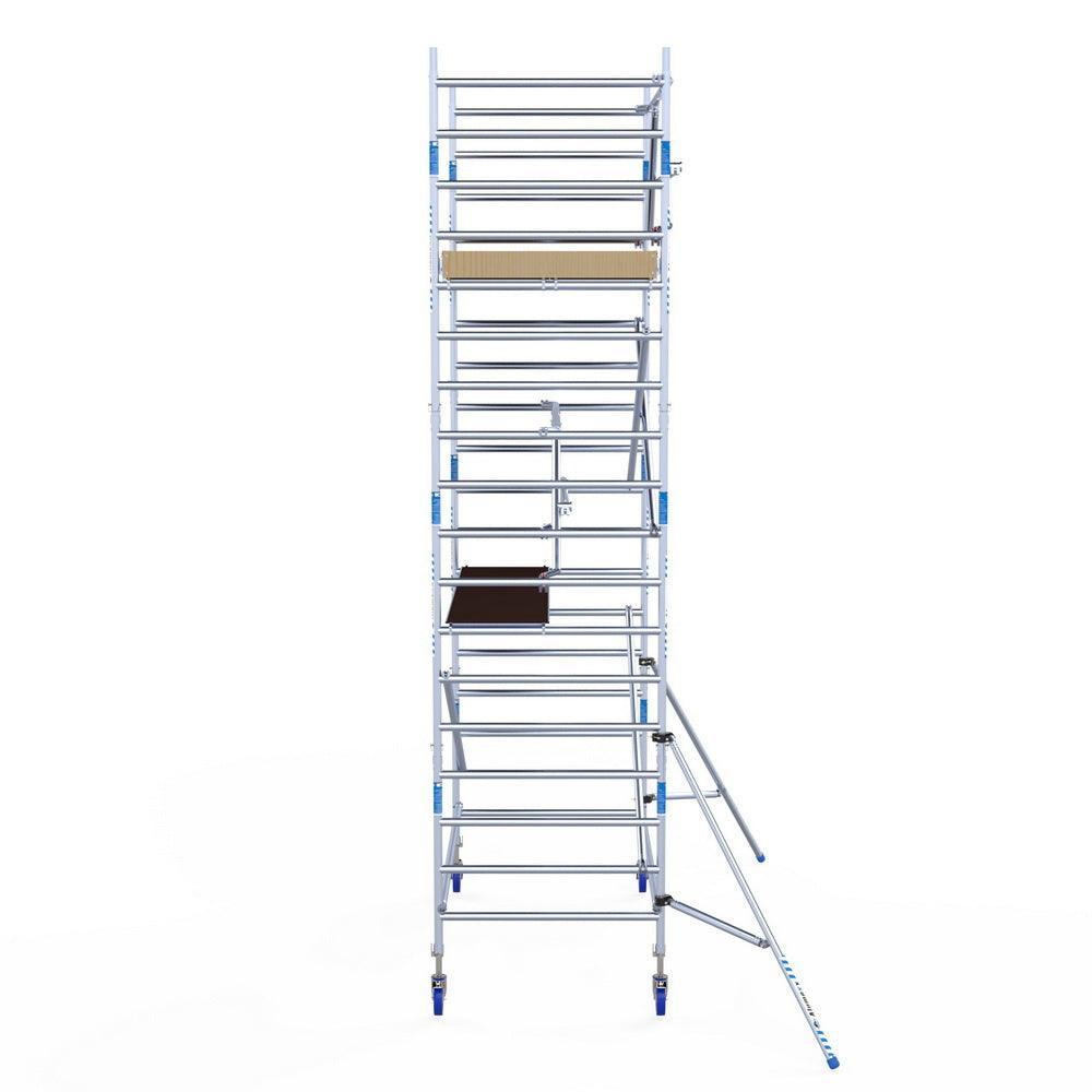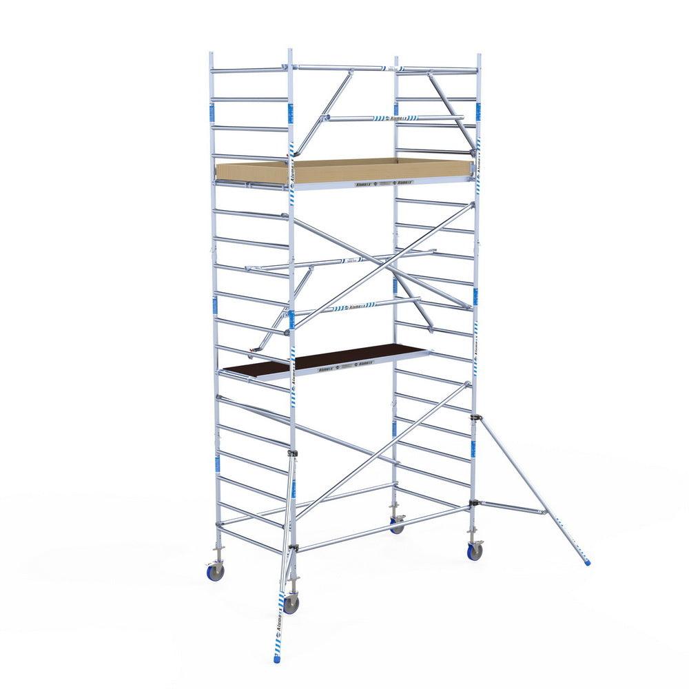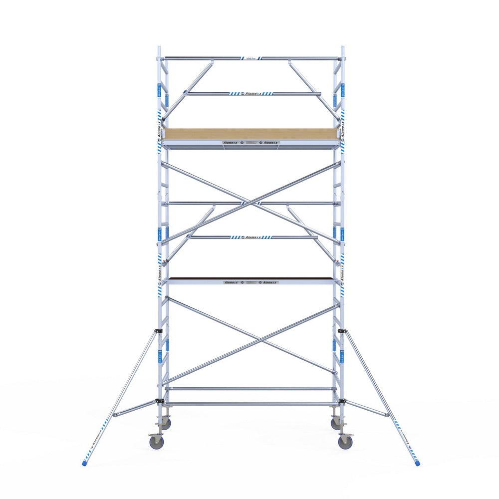 Unsere Rollgerüste sind in verschiedenen Breiten erhältlich, typischerweise 75 cm, 90 cm und 135 cm, abhängig vom jeweiligen Modell und der Produktlinie (semi-professionell oder professionell). Die 75 cm Breite ist ideal für beengte Räume, während 135 cm maximale Arbeitsfläche bietet.