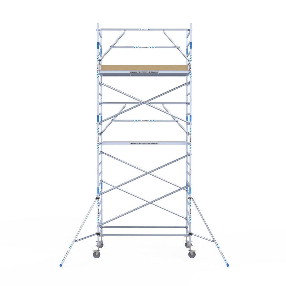 Unsere Rollgerüste sind in verschiedenen Breiten erhältlich, typischerweise 75 cm, 90 cm und 135 cm, abhängig vom jeweiligen Modell und der Produktlinie (semi-professionell oder professionell). Die 75 cm Breite ist ideal für beengte Räume, während 135 cm maximale Arbeitsfläche bietet.