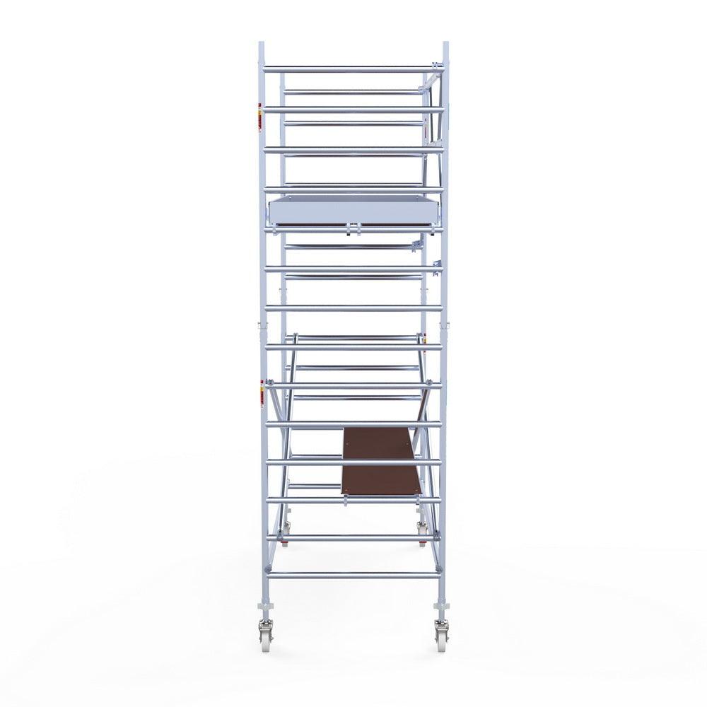 Unsere Rollgerüste sind in verschiedenen Breiten erhältlich, typischerweise 75 cm, 90 cm und 135 cm, abhängig vom jeweiligen Modell und der Produktlinie (semi-professionell oder professionell). Die 75 cm Breite ist ideal für beengte Räume, während 135 cm maximale Arbeitsfläche bietet.