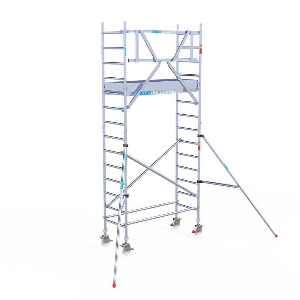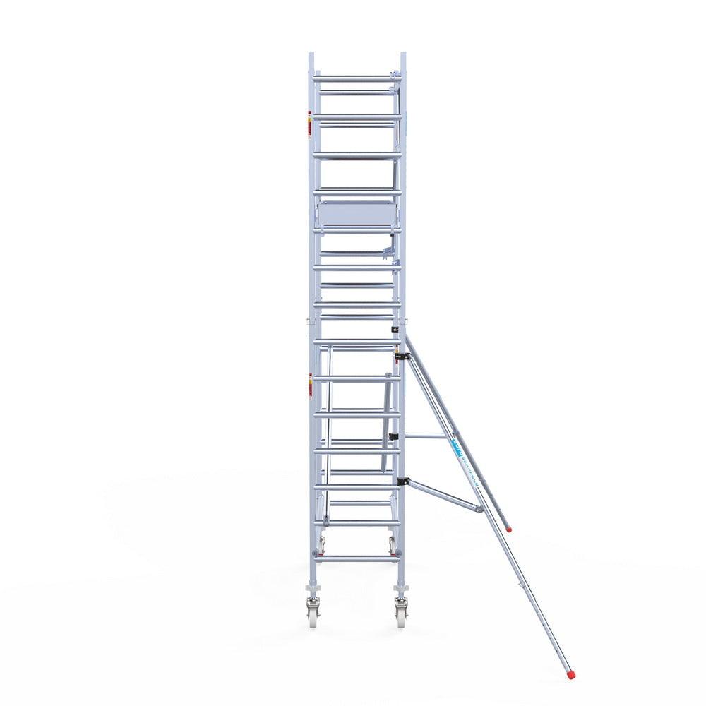 Unsere Rollgerüste sind in verschiedenen Breiten erhältlich, typischerweise 75 cm, 90 cm und 135 cm, abhängig vom jeweiligen Modell und der Produktlinie (semi-professionell oder professionell). Die 75 cm Breite ist ideal für beengte Räume, während 135 cm maximale Arbeitsfläche bietet.
