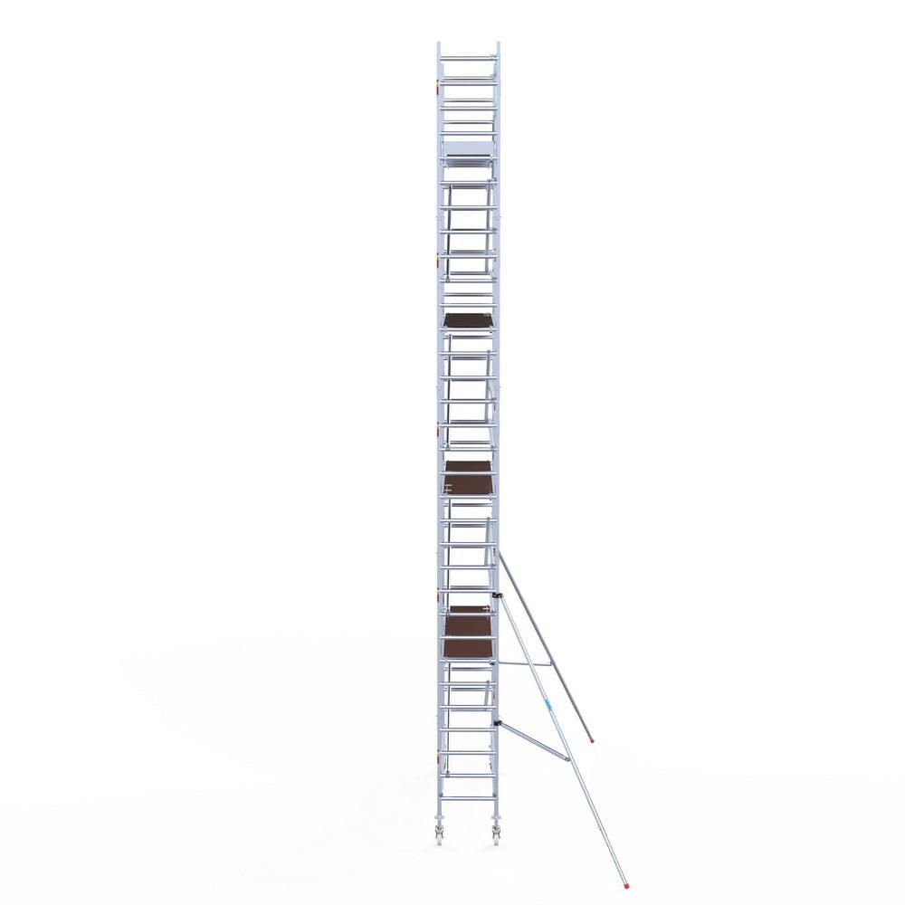 Unsere Rollgerüste sind in verschiedenen Breiten erhältlich, typischerweise 75 cm, 90 cm und 135 cm, abhängig vom jeweiligen Modell und der Produktlinie (semi-professionell oder professionell). Die 75 cm Breite ist ideal für beengte Räume, während 135 cm maximale Arbeitsfläche bietet.