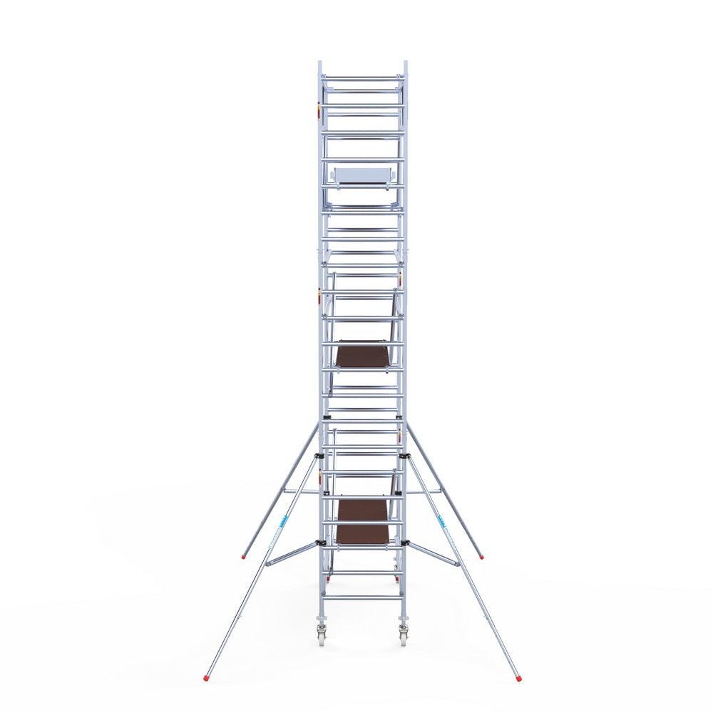 Unsere Rollgerüste sind in verschiedenen Breiten erhältlich, typischerweise 75 cm, 90 cm und 135 cm, abhängig vom jeweiligen Modell und der Produktlinie (semi-professionell oder professionell). Die 75 cm Breite ist ideal für beengte Räume, während 135 cm maximale Arbeitsfläche bietet.