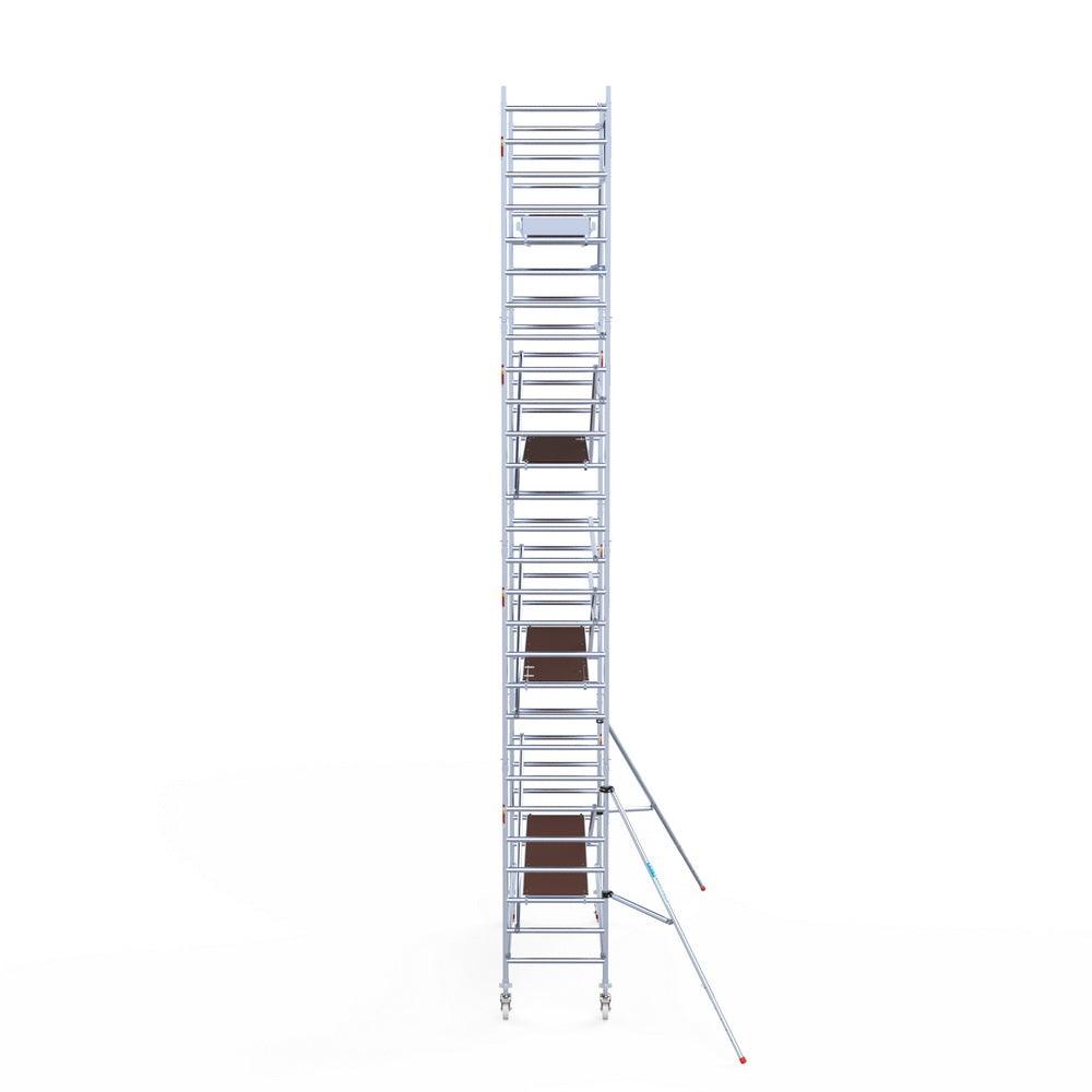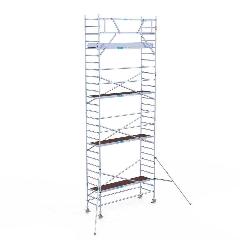 Unsere Rollgerüste sind in verschiedenen Breiten erhältlich, typischerweise 75 cm, 90 cm und 135 cm, abhängig vom jeweiligen Modell und der Produktlinie (semi-professionell oder professionell). Die 75 cm Breite ist ideal für beengte Räume, während 135 cm maximale Arbeitsfläche bietet.