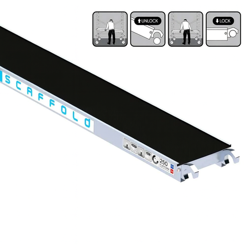 Euroscaffold schmale Rollgerüstplattformen 250 x 0,30 m ohne Klappe Dieses Rollgerüst ohne Klappe besteht aus einem geschweißten Aluminiumrahmen mi...