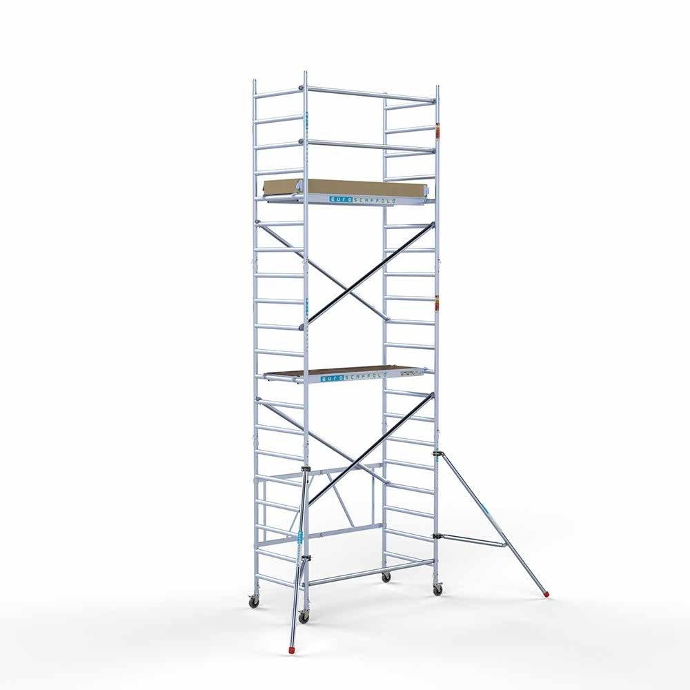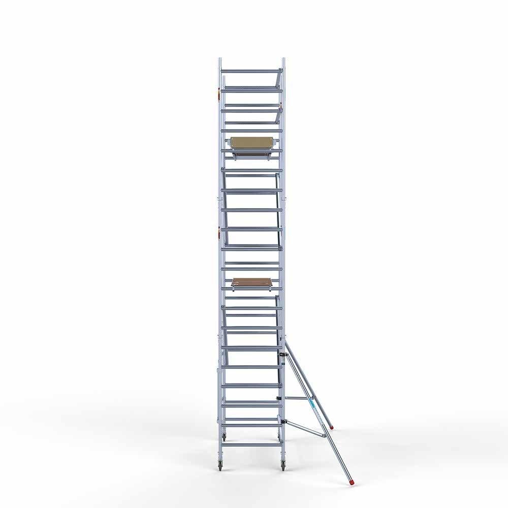 Unsere Rollgerüste sind in verschiedenen Breiten erhältlich, typischerweise 75 cm, 90 cm und 135 cm, abhängig vom jeweiligen Modell und der Produktlinie (semi-professionell oder professionell). Die 75 cm Breite ist ideal für beengte Räume, während 135 cm maximale Arbeitsfläche bietet.