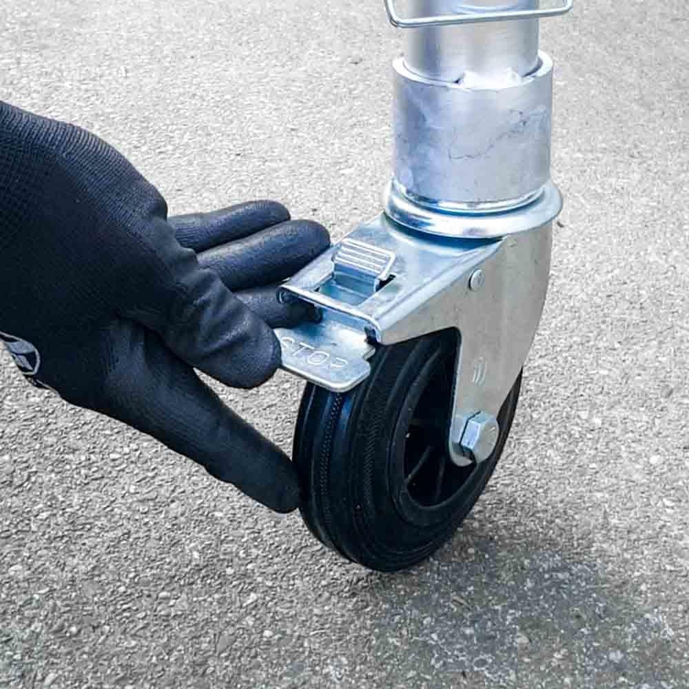 Die Kammergerüsträder von Euroscaffold verfügen über ein gutes Bremssystem und eine Ausfallsicherung. Dieses Gerüstrad mit Stahlspindel ist doppelt gebremst und nicht höhenverstellbar. Die universellen Gerüsträder passen auf alle Arten von Raum- und Rollgerüsten bekannter Marken wie Altrex, Skyworks, Euroscaffold und Custers. Der Durchmesser des Rohrs beträgt 46 mm, so dass die Rollen auf Rohre von 48 und 50 mm passen. Die maximale Belastung pro Rad beträgt 180 kg. Die Räder sind aus Gummi und hinterlassen keine Spuren auf dem Boden. Die Euroscaffold Gerüsträder sind TÜV-zertifiziert und entsprechen den Sicherheitsanforderungen der EN 1004. Der Preis versteht sich pro Stück.