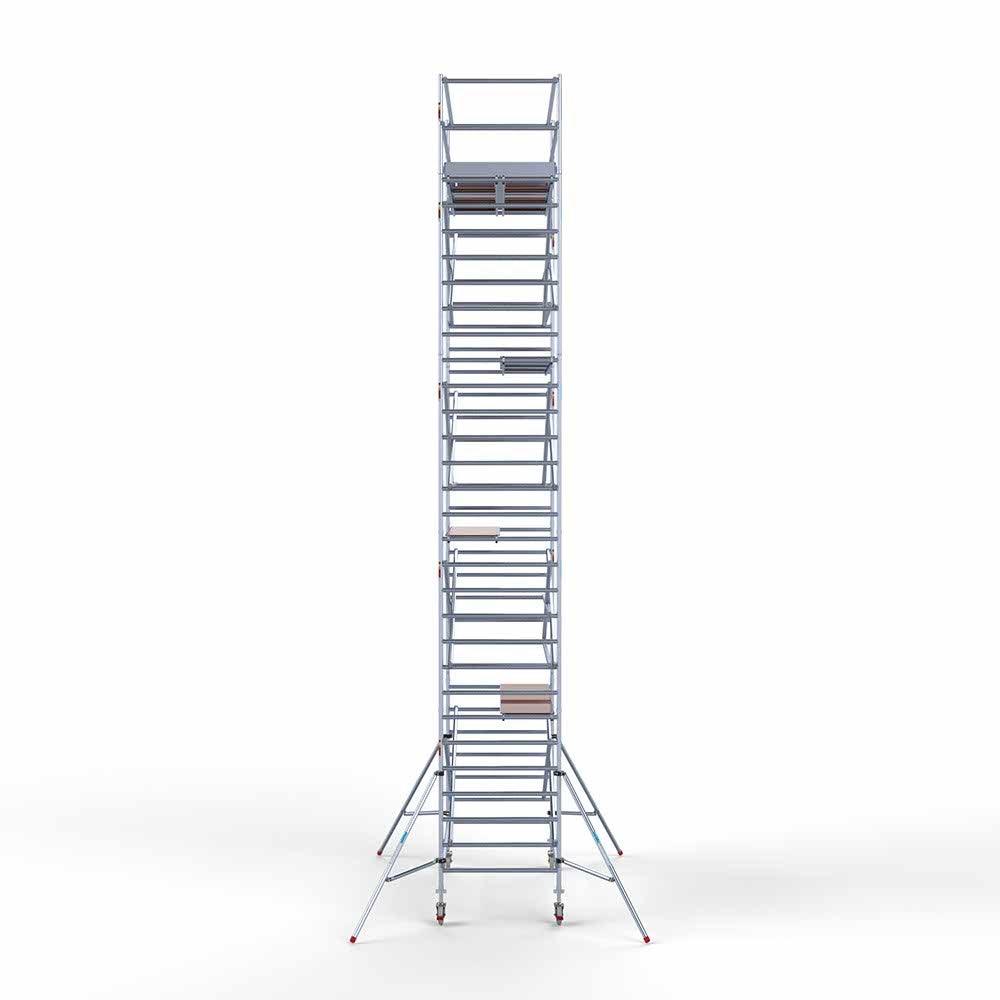Unsere Rollgerüste sind in verschiedenen Breiten erhältlich, typischerweise 75 cm, 90 cm und 135 cm, abhängig vom jeweiligen Modell und der Produktlinie (semi-professionell oder professionell). Die 75 cm Breite ist ideal für beengte Räume, während 135 cm maximale Arbeitsfläche bietet.